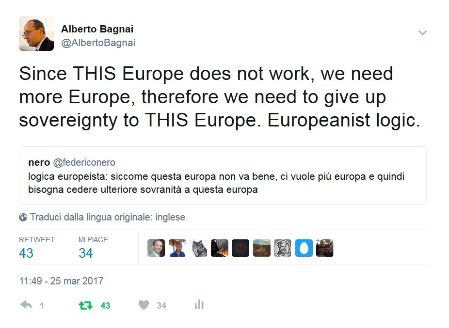 Darsi un ordinamento sovranazionale che non esiste in nessuna parte del mondo, pensando che quello che gli altri non hanno fatto perché è irrazionale a noi riuscirà perché "noi europei" siamo migliori degli altri è la peggiore forma di nazionalismo!