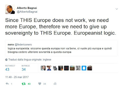 Professore avevano ragione "gli intellettuali che sanno di politica, che te lo dicono anche: "Sai, Bagnai, tu fai la maestrina, ma la verità è che l'euro non è un progetto economico ma politico, serviva a creare un'identità europea che è bella, mentre quella nazionale è brutta".PER LORO ERA BRUTTA L'IDENTITA'NAZIONALE PERCHE' SI TRATTAVA DELL' IDENTITA' DELLA NOSTRA COSTITUZIONE;LAVORISTA E KEYNESIANA, CHE I TRATTATI GIA' DA ALLORA MIRAVANO A DISATTIVARE ANCHE CON LA COLLABORAZIONE DELL' ACCADEMIA "CATTURATA DALL' ORDOLIBERISMO .