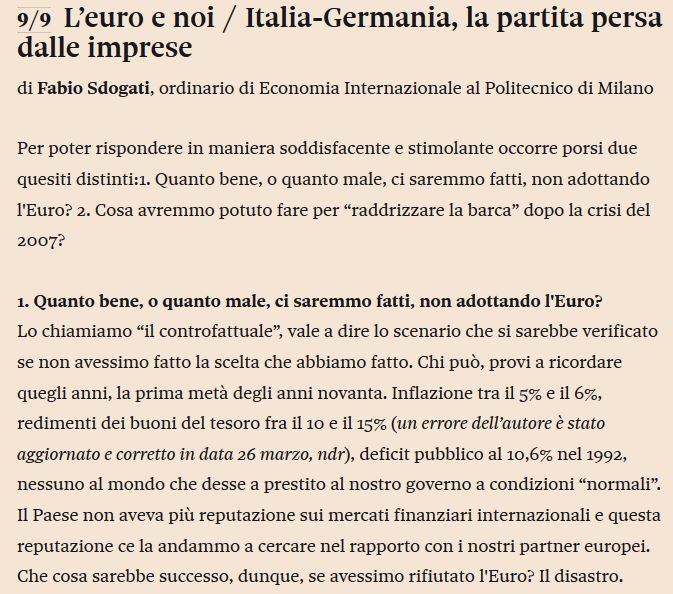 RispondiEliminaSo che anche con l'inflazione a doppia cifra non avremmo dovuto abbandonare la lira, ma semplicemente cercavo di capire la presenza in rete di tale articolo, ora che è stato disinnescato del suo potere ingannatore.