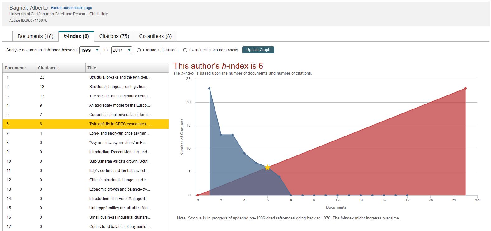 Un h-index di 3 con 78 citazioni e quattro pubblicazioni Scopus. Se non vi ricordate come si consulta il grafico, potete rileggervi questo post.