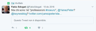 Devo dire che questo gesto mi ha un po' umiliato, ma non voglio parlarvi ora di questo. Magari domani vi spiegherò perché (sicuramente chi è del mestiere mi capisce). Comunque, incuriosito dalla figura di questo studioso che si fa bacchettare così da un giornale che in fondo lo aveva chiamato per fare esattamente quello che lui ha fatto (e che in altri tempi gli sarebbe andato liscio), ho fatto un giro sulla sua tweet line, trovando delle autentiche perle come questa: