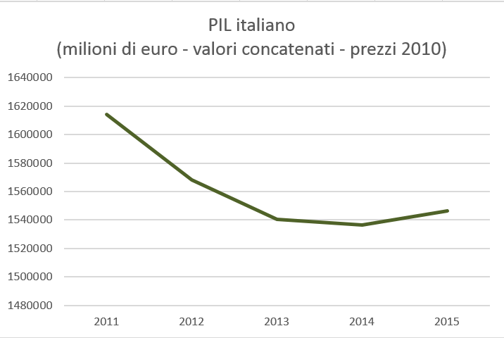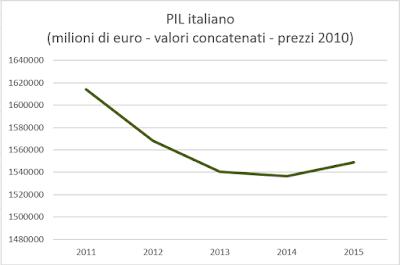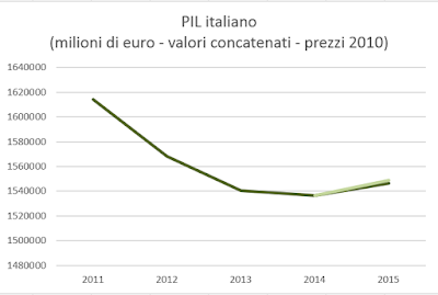 La differenza fra la realtà e gli auspici è impercettibile, ma non potrebbe essere altrimenti, atteso che essa è appunto lo 0.8%-0.6%=0.2% del PIL del 2014 (visto che dal 2014 siamo cresciuti dello 0.6% e non dello 0.8%), cioè all'incirca 2.4 miliardi di euro (su circa 1536 del PIL 2014). Insomma, nel 2015 abbiamo fatto 1546 anziché 1548 miliardi di euro. Questo è stato l'oggetto del contendere fra Daveri e l'ISTAT, e forse, a questo punto, sarebbe meglio che per carità di patria il post si chiudesse qui, perché il grafico fa ben capire che di questo passo ci vorranno anni anche solo per tornare ai valori del 2011 (e su quanto ci vorrebbe per tornare a una vita normale non vi intrattengo, avendolo fatto tanto tempo fa, e non volendo guastarvi la giornata... anzi: ci ho ripensato: guastatevela!).