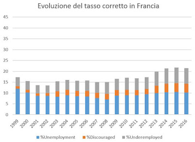 Faccio notare un altro dettaglio. La Francia sta meglio di noi, ma peggio della Germania, la cui situazione migliora stabilmente dal 2005 in poi, con l'entrata a regime del dumping salariale Hartz. Tuttavia, il peggioramento della disoccupazione "corretta" in Francia è molto persistente, più del nostro. Dopo la crisi, non solo la Spagna (dal 2013) ma perfino l'Italia (dal 2014) vedono una correzione (più lieve da noi). La Francia no.