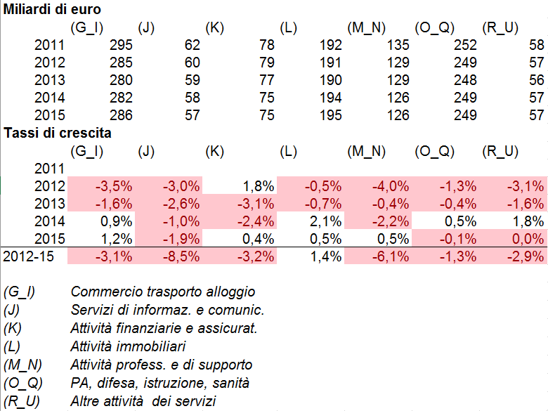 C'è un solo settore che sta meglio oggi di quanto non stesse nel 2011, ed è quello delle attività immobiliari. La bastonata più forte l'hanno avuta i servizi di informazione e comunicazione, e le attività professionali e di supporto. Temo che avrete diversi aneddoti da raccontarmi. Notate la dinamica delle attività finanziarie e assicurative, che nel 2012, in piena crisi finanziaria, erano le uniche a conoscere un tasso di crescita vicino al 2%. Controintuitivo, ma questo dicono i dati.