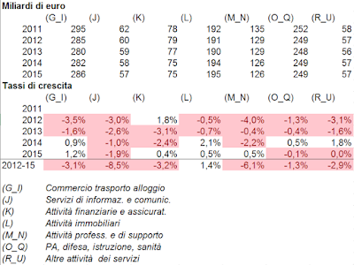 Nel 2015 l'agricoltura ha fatto un bell'exploit, con un tasso di crescita quasi al 4%. Peccato che conti per il 2% del valore aggiunto totale, e quindi non abbia potuto contribuire un gran che alla ripresa (ma son contento per gli agricoltori). Contano di più le costruzioni, anche se il loro peso sul totale sta inesorabilmente slittando (dal 5.3% del 2011 al 4.6% del 2015), e questo perché il tasso di crescita del settore è costantemente negativo. Lo è anche quest'anno, per l'1% tondo. L'industria in senso stretto (totale meno costruzioni) quest'anno si riprende, dopo tre anni di tassi di crescita negativi. Prosegue la terziarizzazione dell'economia: il peso del servizi quest'anno resta stabile a 74.7% del totale, era 73.8% nel 2011.