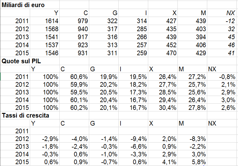 Intanto, una prima constatazione: nel 2015 l'Italia (rectius: il PIL italiano, ovvero la somma dei redditi percepiti da tutti gli operatori economici che hanno agito sul territorio del paese, ovvero la somma dei valori aggiunti dei diversi settori dell'economia italiana, ovvero la somma delle diverse voci di spesa di famiglie, imprese, settore pubblico e settore estero) è cresciuta dello 0.6%, anziché dello 0.8% come sembrava fosse appena qualche giorno fa.