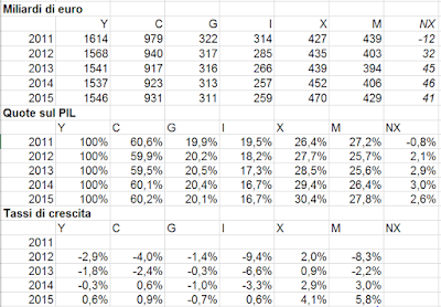Altro dettaglio, i consumi collettivi (G), cioè la spesa della pubblica amministrazione per stipendi e acquisti di beni. L'unica voce ancora in caduta libera nel 2015, a indicare che l'austerità prosegue (anche se tutti dicono che è sbagliata, ma nel dubbio...).