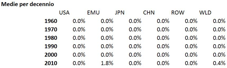Vi presento i risultati "tagliati" per decenni, perché lo "shock" (la maggior crescita europea rispetto allo scenario storico) viene analizzato a partire dal 2010 (primo anno dopo la recessione). Ovviamente in tutti i decenni precedenti lo scostamento del controfattuale dallo storico è nullo. Nel decennio in cui viene applicato lo shock, cioè, rectius, nel quinquennio fra il 2010 e il 2014 (fino a dove arrivano i dati), risulta che se l'Eurozona fosse cresciuta allo stesso ritmo sperimentato nel quinquennio 1994-1998 avrebbe avuto 1.8 punti percentuali di crescita in più, e il mondo 0.4 punti di crescita in più (arrivando a una crescita del 3.2%, pari a quella degli anni '80, o del periodo 2002-2008). Tutto questo senza considerare gli spillover (come dicono i fichi) sulle altre economie.