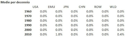 Spiegazione: negli anni '60 il mondo cresceva in media di cinque punti percentuali all'anno, dei quali uno attribuibile agli Usa, due all'Eurozona, uno al Giappone, e due al resto del mondo (il contributo della Cina era virtualmente nullo). A beneficio dei sadici anali feticisti del decimale, in fondo al post riporto la tabella senza arrotondare all'intero più vicino: è meno leggibile, ma perché privare di questa innocente perversione i nostri cortesi lettori?