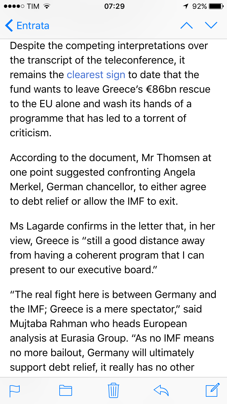 Il Fondo monetario internazionale, dopo aver proposto il piano di aggiustamento del quale abbiamo indicato qui l'assurdità e il totale spregio dell'evidenza scientifica e della vita umana (nota: presidenta francese, capo economista francese - ma tanto keynesiano, signora mia! - e banche francesi più esposte di quelle tedesche verso la Grecia: cosa poteva venirne fuori?...), adesso si rende conto che non può mettersi in urto con tutti i paesi emergenti per continuare a finanziare gli squilibri causati dall'euro, e quindi vuole - pilatescamente - lavarsene le mani e lasciare il cerino alla Germania. Pilatescamente, perché gli squilibri, che il Fmi oggettivamente non ha creato (preesistevano al suo intervento), sono però oggettivamente stati amplificati dall'assurda ipotesi del Fmi che il moltiplicatore dell'economia greca fosse 0.5, per cui l'austerità avrebbe risolto tutto (mentre ha risolto solo i problemi di qualche banca francese).