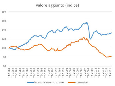 Sono dati che dovrebbero essere facili da interpretare alla luce di quanto sapete sugli agganci valutari. Il cambio forte deprime la produttività del manifatturiero, ma porta tassi bassi che incentivano la produzione nelle costruzioni. Poi c'è il redde rationem (crisi di bilancia dei pagamenti), il manifatturiero riparte, ma le costruzioni per un po' si fermano. Anche in questo caso la crisi del 1992 (preceduta dall'aggancio valutario 1987-1992) è una prova generale, su scala molto inferiore, di quello che vediamo succedere oggi, con un paio di differenze: non abbiamo recuperato ancora il livello pre-crisi, e lo scivolone post-crisi delle costruzioni è durato molto, molto più a lungo.