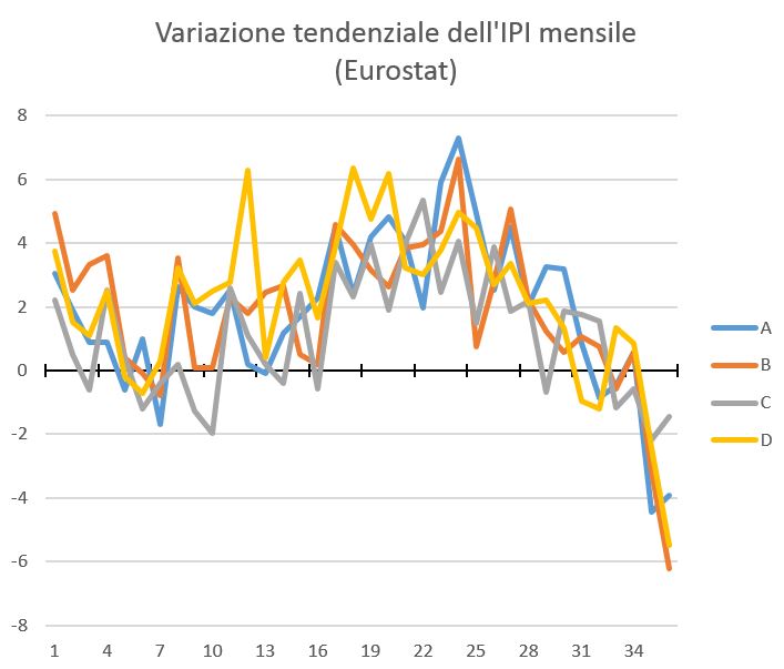 Compitino: la figura rappresenta il tasso di variazione tendenziale (mese su corrispondente mese dell'anno precedente) dell'indice della mensile produzione industriale nell'industria in senso stretto (escluse le costruzioni) nei quattro principali paesi dell'Eurozona.