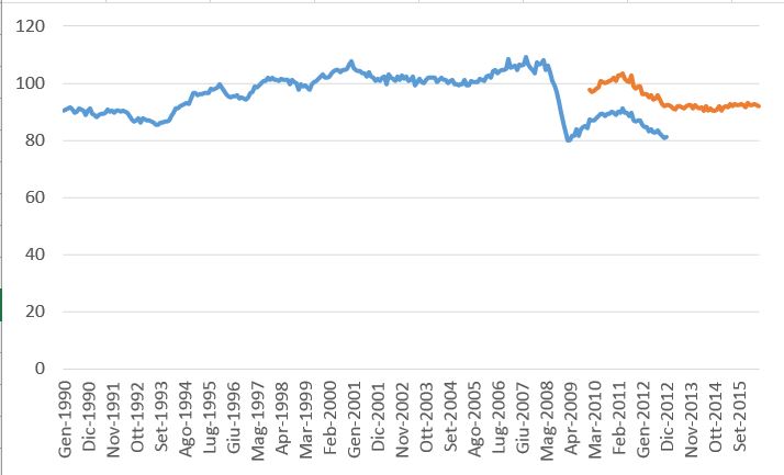 Ecco: qui avete il destagionalizzato mensile vecchia base (in blu) e nuova base (che parte dal gennaio 2010). Potrete constatare dal periodo di overlap che le due serie hanno dinamica sostanzialmente identica. Se le aggiuntiamo, otteniamo questa serie (base 2010):