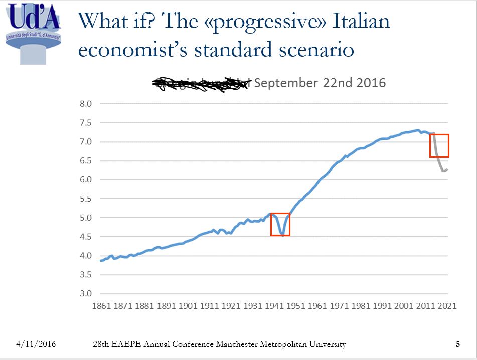 Seguirà patriottico appello a difendere la credibilità della professione evitando di dire troppe cazzate, e poi la sostanza del lavoro, cioè il tentativo di avviare una riflessione seria sui costi di una dissoluzione dell'euro (non ha senso parlare di "uscita dall'euro", perché presuppone che l'euro possa resistere, il che evidentemente non è, quindi la nostra volontà di uscire, e soprattutto quella di restare, espressa dai personaggi in cerca di editore, è del tutto irrilevante...). Una riflessione che deve essere basata su quello che sappiamo, e che ogni giorno cambia (ad esempio: ora sappiamo che prima dell'uscita ci sarà una crisi bancaria, cosa che nel 2014 speravamo di poter evitare), e che magari vi presento al #goofy5 (vedo che ci sono ancora un centinaio di posti, però non vorrei che ci trovassimo a dover noleggiare un lotto di ricevitori in più per una sola persona, quindi farò fare una verifica e magari la chiudiamo anche qui, tanto siamo già di più rispetto all'anno scorso...).