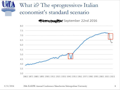 Certo che la baggianata detta da .....ini (di cui domani non farò il nome perché sarebbe poco elegante), se ne fai il disegnino (prima slide), fa veramente luce! -40% in un anno seguito da -15% per almeno tre anni significa quasi due seconde guerre mondiali (nel quadro il rettangolo rosso misura appunto la perdita di output verificatasi durante la seconda guerra mondiale). Aprono la bocca e gli danno fiato, firmano la qualunque, si associano a personaggi dal curriculum scientifico evanescente, e questo perché? Alla fine, cosa stanno dimostrando? Che non sanno di cosa parlano, e non lo sanno perché ideologicamente si rifiutano di studiarlo, motivo per il quale, nel momento in cui quello che deve succedere succederà, verranno accantonati in quanto inetti. Ci sarebbe poi quel problema degli Hamptons. Perché se tu fai capire che quello che è un problema per decine di milioni di persone nel tuo paese per te non lo è, allora, forse, fai meglio a fare come faccio io: vai in cima al Greco, che lo difendi meglio!