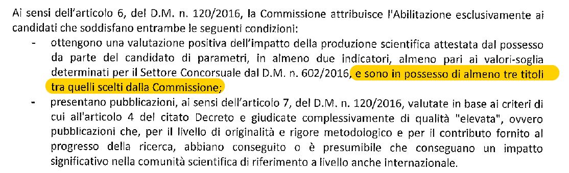 Io sono sopra tre indicatori e ho almeno cinque titoli, quindi la condizione necessaria c'è. Poi bisogna vedere se quello che ho scritto è di qualità elevata, e bisognerebbe vederlo prima che sia il tempo a giudicarlo! (ma le commissioni si sono date tempo fino a marzo).