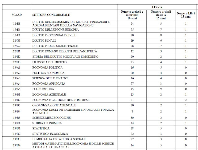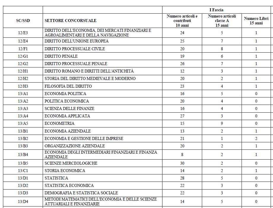 Per darvi un'idea, considerando le varie pubblicazioni "eleggibili" (come dice il sito del ministero, traducendo "eligible", che in italiano significa "idoneo": lasciamo perdere...), i vari "valori soglia" dei settori disciplinari economici (di area 13), io sono sopra a tutte e tre le soglie in tutti i settori: